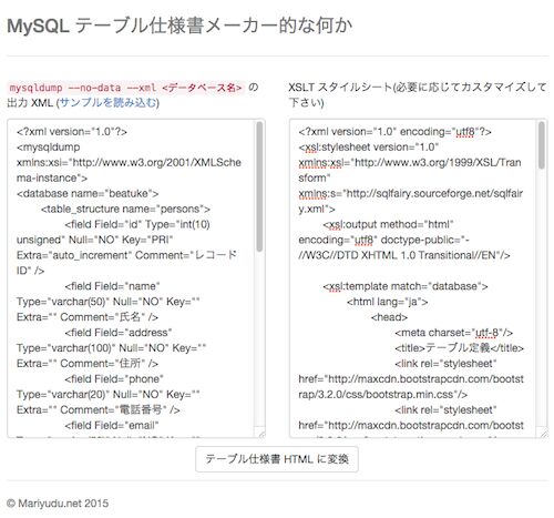 以前書いた「MySQL データベースからテーブル定義書を生成する」が、地味にアクセスがあるようです(当社比)。ナウでヤングで意識高いギークさんには見向きもされないような類の古臭いイシューだと思ってましたが、平成27年のニッポンでは現在進行形の悩まし…